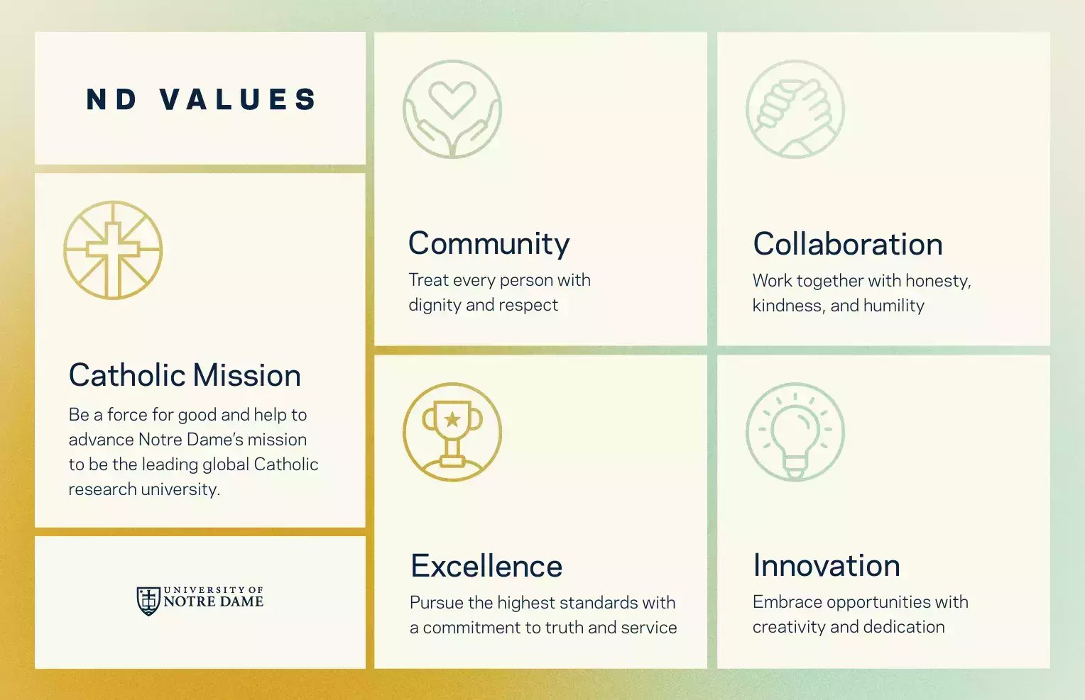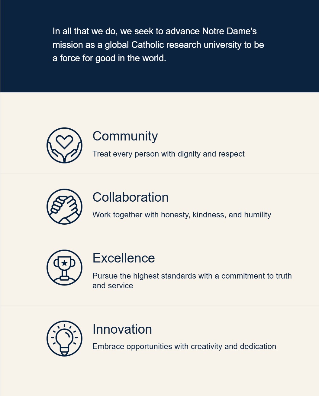 To be a force for good and help to advance Notre Dame’s mission to be the leading global Catholic research university.