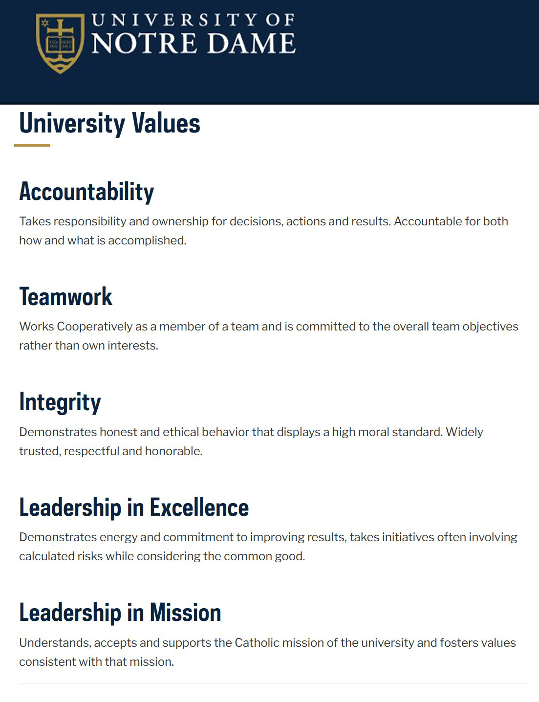 Leadership in Mission: Understands, accepts and supports the Catholic mission of the university and fosters values consistent with that mission.