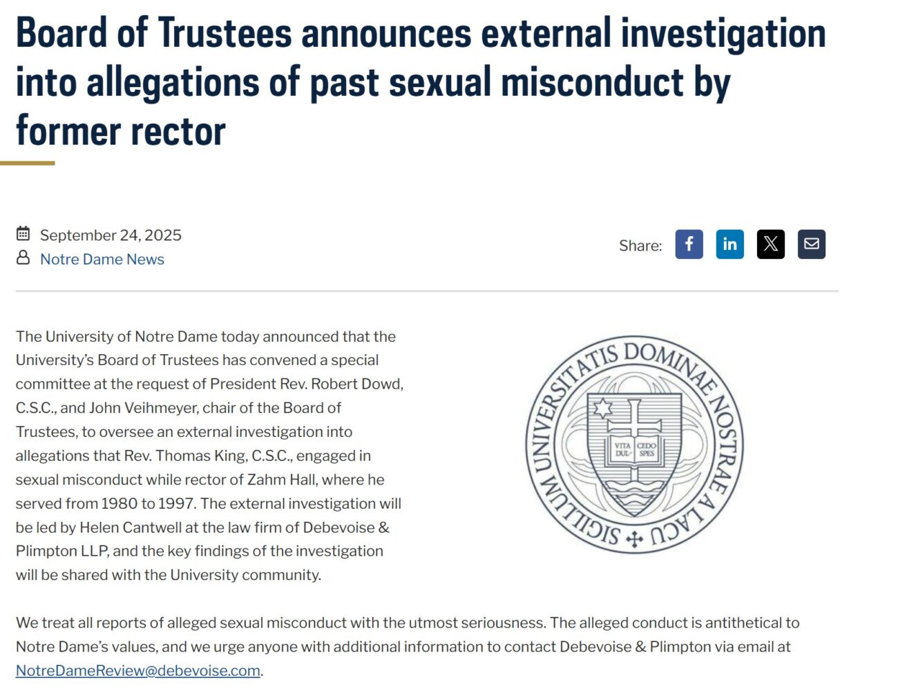 This is a commendable move by Father Dowd and chairman Veihmeyer. The thoroughness of this investigation and the response of the administration will be critical to maintaining the integrity of the University. The disclosure in the earlier years of the century of an epic number of cases of sexual abuse by clergy and widespread cover-ups by superiors severely damaged the Church and some of its institutions. Let us pray that the Holy Spirit guide Ms. Cantwell and her associates in their quest for truth and justice.